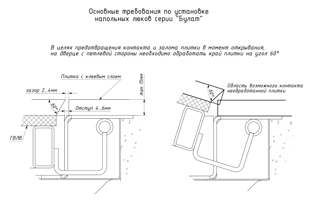 Удобный монтаж в установочный проем 110х90 с зазором, крепление рамы в плиту через полку наличника в нулевую отметку чистого пола с последующей отделкой поверхности облицовочными материалами: плиткой, ламинатом.